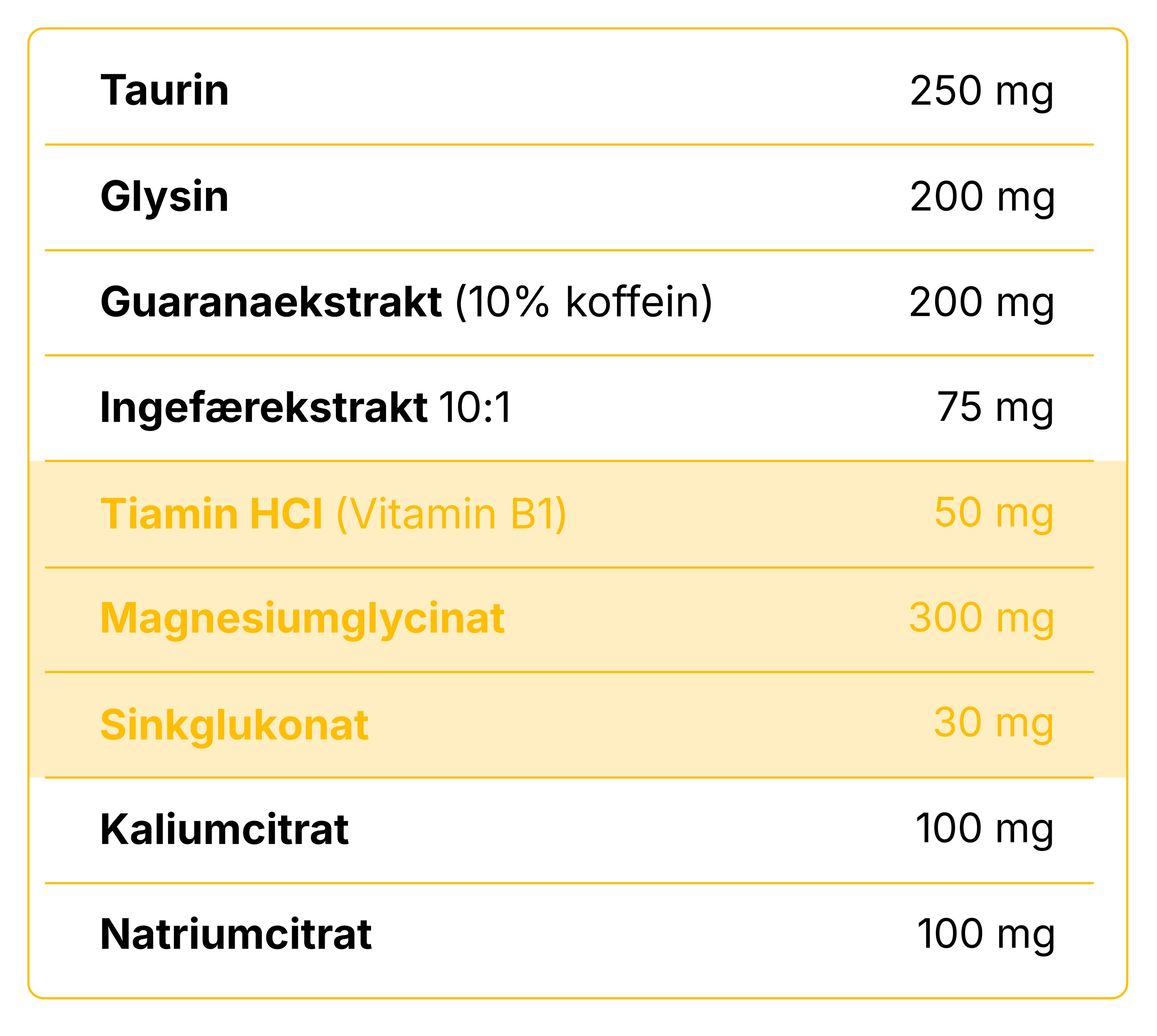 Unhang inneholder vitamin B1 (tiamin), som bidrar til normal energiomsetning, og aminosyrene taurin og glysin, som støtter kroppens egne antioksidantprosesser.